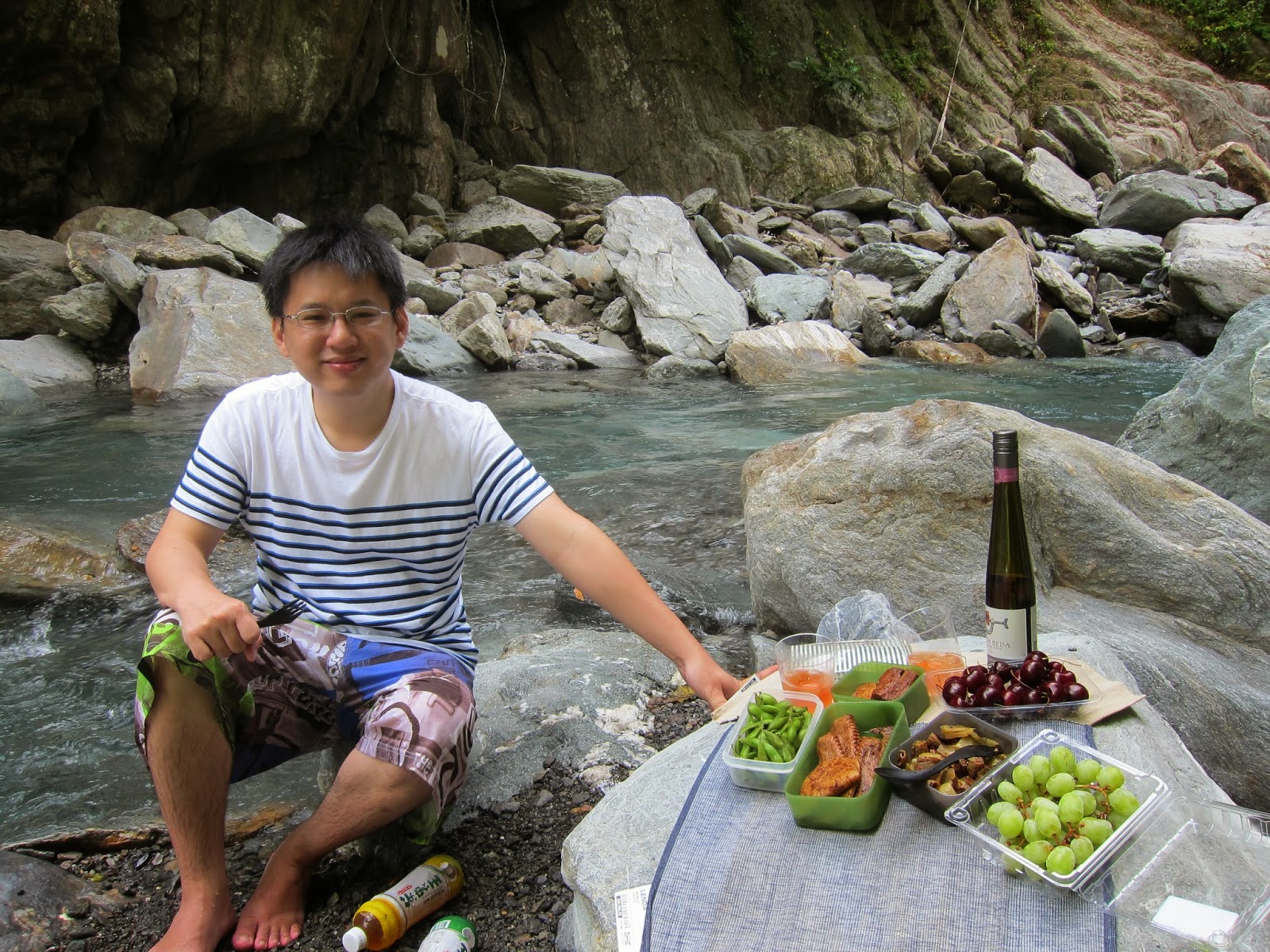 登登!除了有烤雞翅、豆干、毛豆和甜不辣等魯味之外,還有葡萄和櫻桃,還有一瓶白酒,冰鎮在冰涼的河水中之後,在這個幽靜又清澈的河谷中,在上午時段,除了偶爾要溯溪的隊伍之外,幾乎沒有人打擾,喝著澄紅晶瑩的酒,果然有種與世隔絕的感覺。